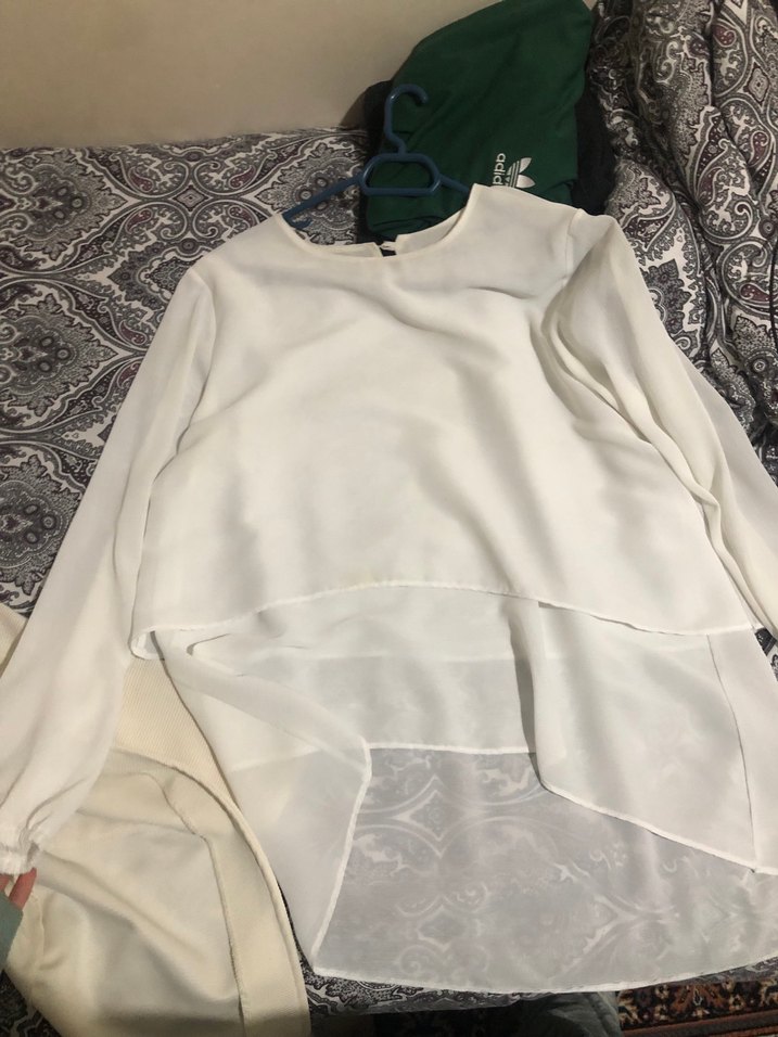 Beyaz, uzun kollu, salaş kesim, drapeli kat kat midi boy bluz. Yuvarlak yaka ve yumuşak sentetik kumaştan, minimal ve rahat tarz için uygun.
