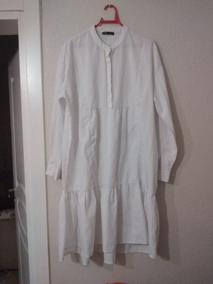 Uzun kollu, salaş kesim beyaz keten tunik. Midi boyda, yakası yuvarlak ve fırfır detaylı, günlük kullanıma uygun minimal tarzda.
