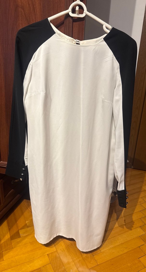 Beyaz midi tunik, uzun kollu ve salaş kesimdir. İpek gibi dokusu, drapeli tasarımı ve yuvarlak yaka detaylarıyla ofis için uygundur. Temiz herhangi bir hatadı yoktur..