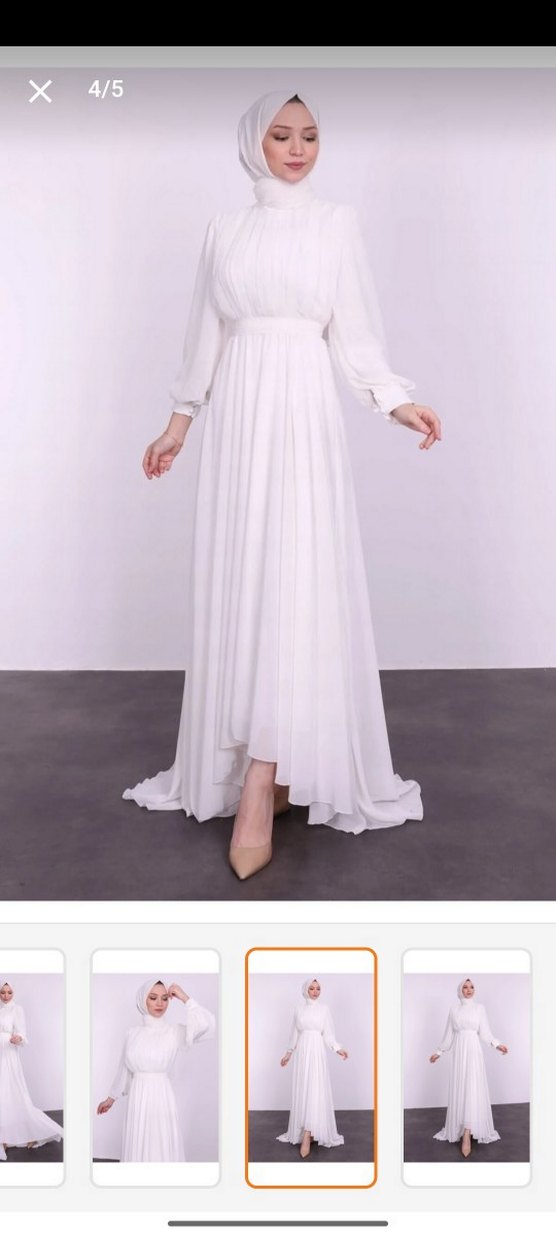Beyaz uzun elbise, saten dokuda, drapeli ve bol kesimdir. Uzun kollu ve tek renk, modern klasik tarzıyla düğünler için uygundur.