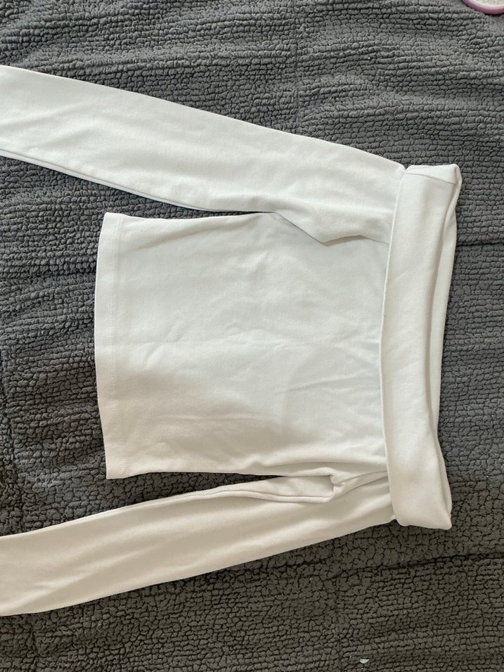Beyaz, uzun kollu ve straplez yakalı crop top. Yumuşak sentetik kumaştan, belde kemer detaylı, minimalist sokak stili için uygun. 1 kere giydim çok güzel ancak bana küçük geliyor