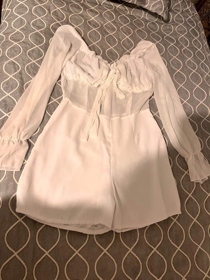 Beyaz mini tulum, straplez ve uzun kollu tasarımıyla, fırfır detaylara sahip. Yumuşak keten kumaştan, bohem tarzda ve pastel renkte, düğün için uygun.1 kere kullandım sorunu bulunmamaktadır