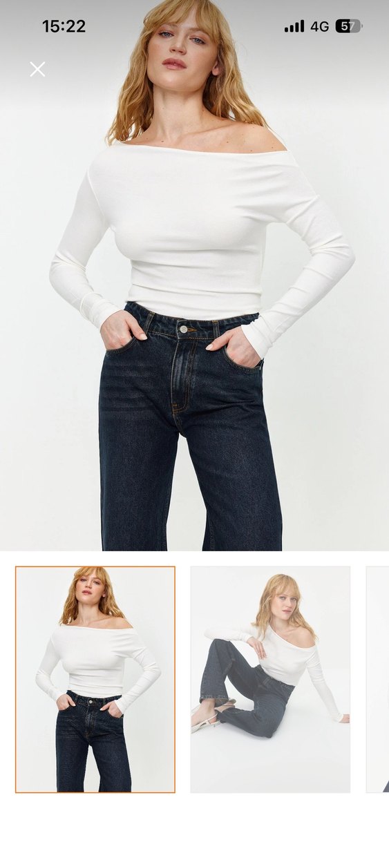 Tekne yaka ve uzun kollu, beyaz renkli, denim kumaştan yapılmış, vücuda oturan kadın bluz. Günlük kullanıma uygun, midi boyda, sade ve şık görünümlü. Penye tarzı