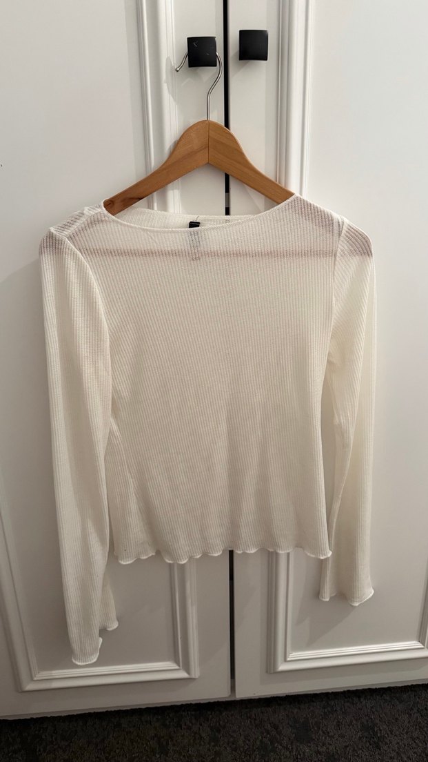 Beyaz uzun kollu, dar kesim ve minimal tasarımlı bluz. Normal midi boyda, düz ve desensiz, günlük sokak stili için uygundur.