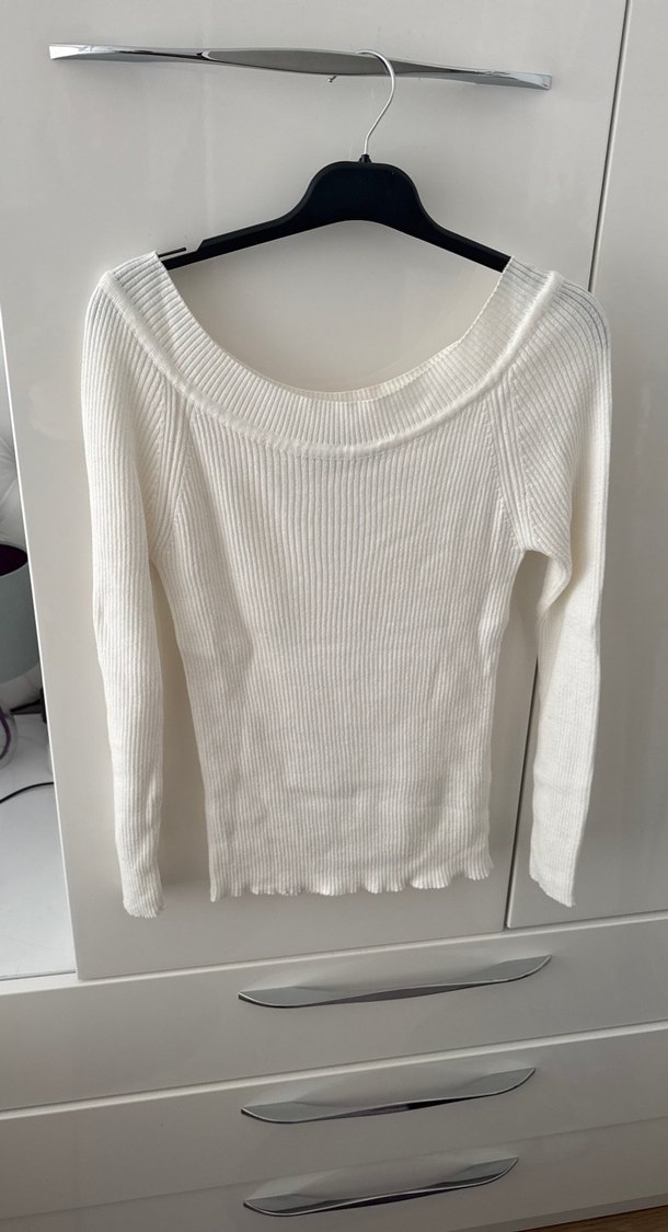 Yumuşak beyaz, triko, kayık yaka ve dar kesim uzun kollu bluz. Sokak stili ve günlük kullanım için uygundur.