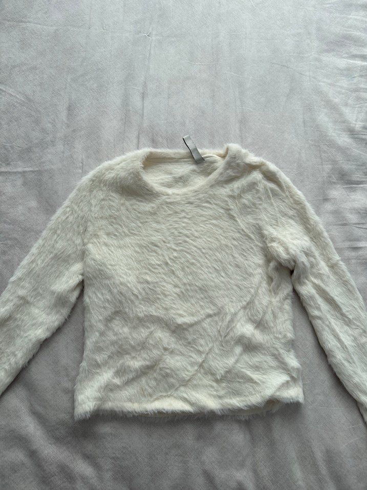 Beyaz renkte, uzun kollu ve yuvarlak yakalı kadın kazak. Normal midi boyda, bol kesim ve tüylü detaylı yumuşak ve sıcak kumaştan üretilmiştir. Düz ve desensiz tasarımıyla rahat kullanıma uygundur.