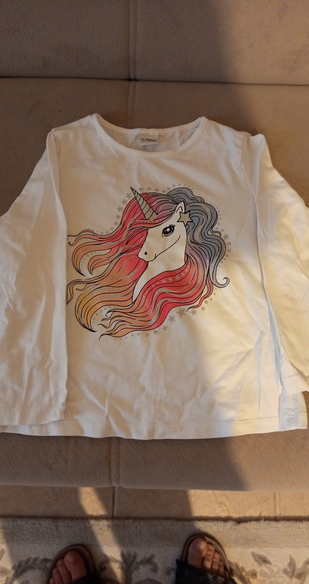 Pamuklu kumaştan, beyaz uzun kollu, bol kesim kız tişörtü. Önünde renkli unicorn baskısı ve yuvarlak yaka bulunur. Bohem tarzda rahat ve şık görünüme sahiptir.
