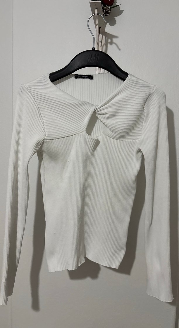 Beyaz renkli, uzun kollu, triko kumaştan yapılmış, v yaka ve dar kesim kazak. Günlük sokak stili için uygundur.