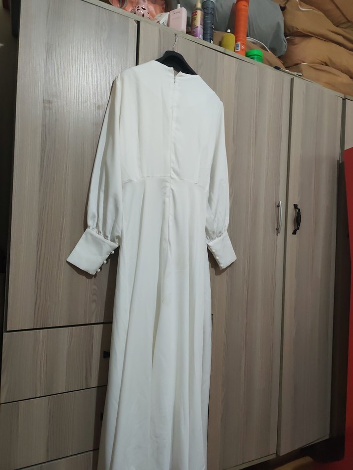 Uzun beyaz elbise, V yaka ve uzun kollu, bol kesim ve yumuşak sentetik kumaştan. Drapeli tasarımıyla modern klasik stil sunar, düğünler için uygundur. Astarlıdir nikahta giyildi hiçbir sorunu yoktur