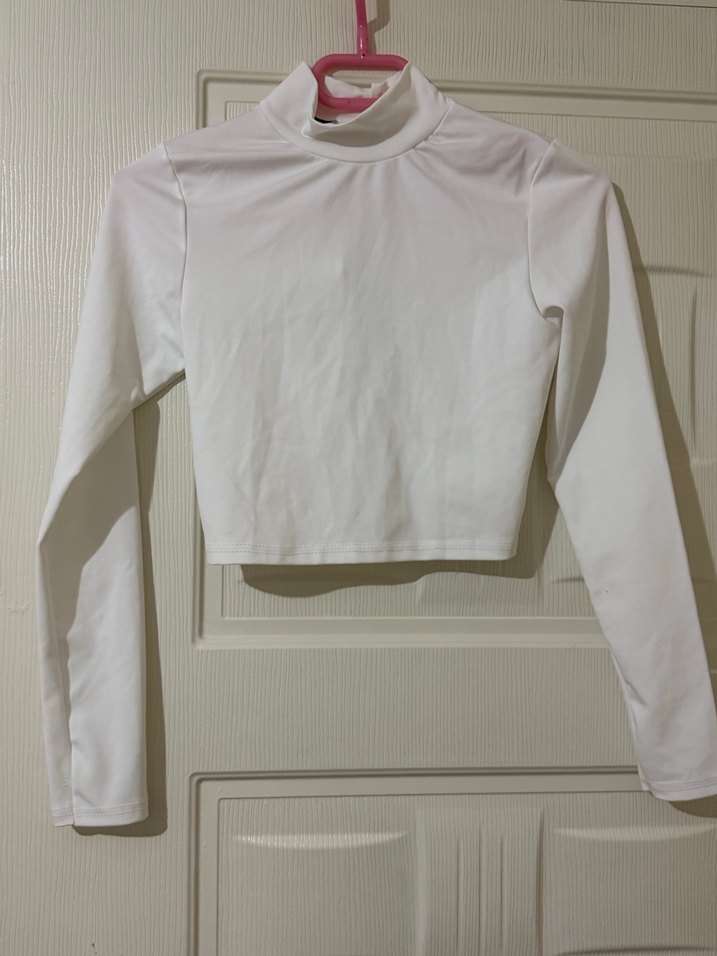 Beyaz, uzun kollu ve yüksek yakalı, fitted kesim yarım crop top. Düz, minimalist ve sokak stili için uygun, sentetik kumaştan yapılmıştır.