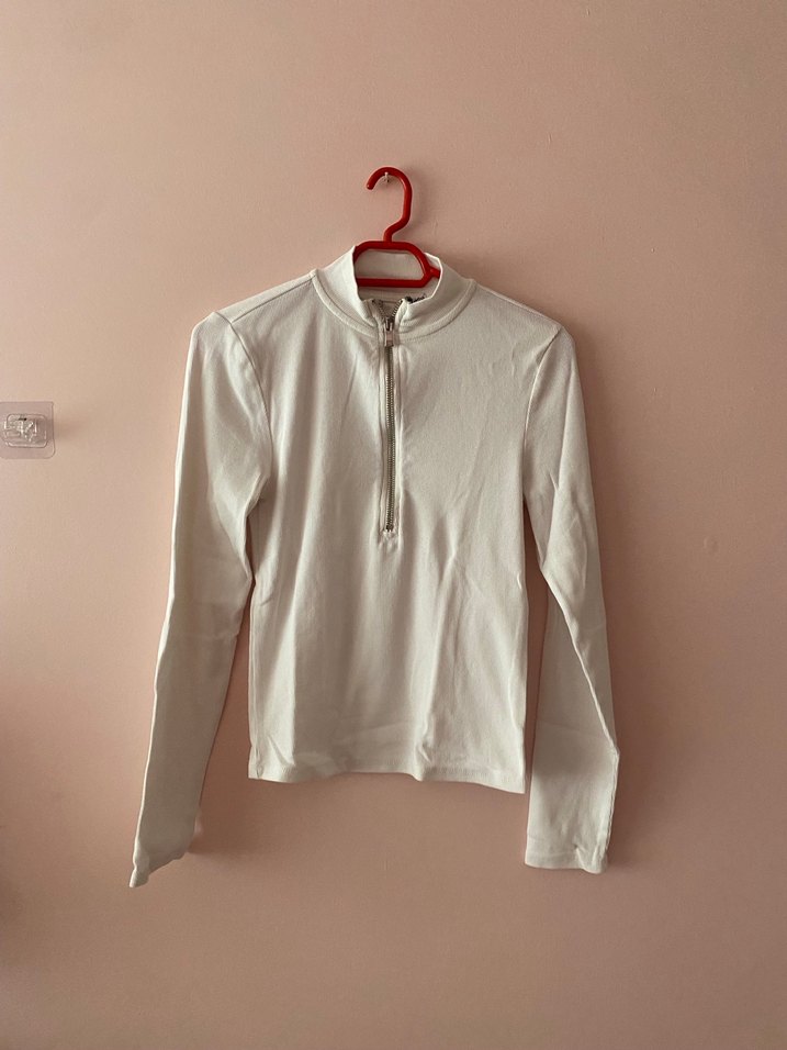 Yarım fermuarlı, uzun kollu ve yüksek yakalı bu beyaz kadın tişörtü, pamuklu yumuşak kumaştan üretilmiştir. Minimalist ve şık tasarımı günlük rahat stil için uygundur. Midi boyda, vücuda oturan kesime sahiptir.