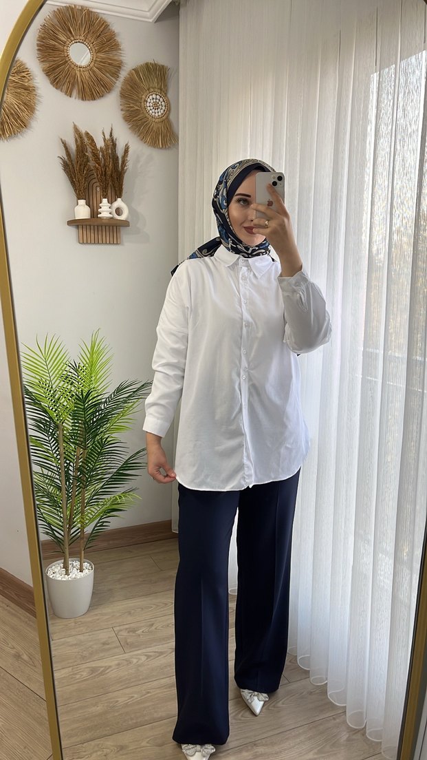 Beyaz Uzun Kollu Yüksek Yakalı Kadın Gömlek