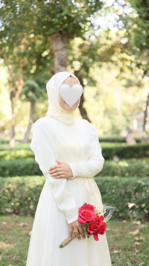 Yüksek yakalı, uzun kollu ve drapeli beyaz elbise, minimalist ve şık bir düğün tercihi için uygundur. Şal ile birlikte satılacaktır