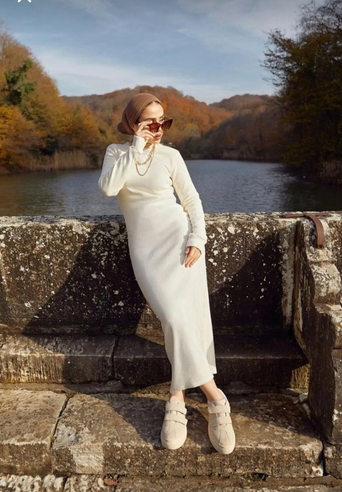 Beyaz uzun kollu, yüksek yakalı ve bol kesim elbise, yumuşak ve sıcak kumaştan yapılmıştır. Sade tasarımıyla zahmetsiz şıklık sunar. hiç giyilmedi standart beden