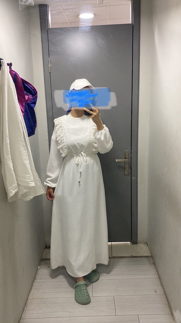 Beyaz renkli, yüksek yakalı ve uzun kollu, bol kesim uzun elbise. Ön kısmında fırfır detayları ve ayarlanabilir bağcıklı bel bulunur. Hafif ve düzgün dokulu kumaş.