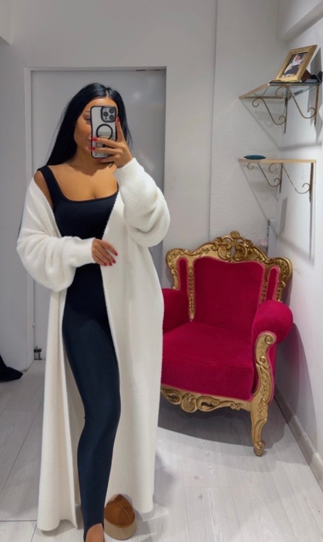 Yumuşak ve sıcak kumaştan, uzun kollu ve vücuda oturan beyaz uzun hırka. Straplez yaka ile günlük kullanıma uygun rahat ve şık görünüm sunar. Yepyeni sıfır ayarında