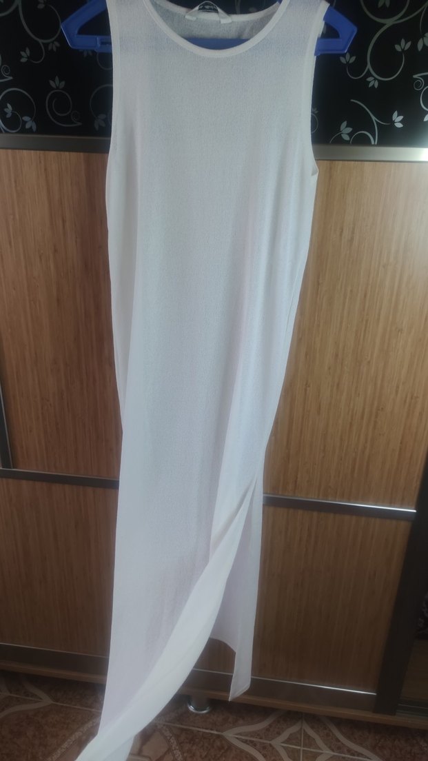 Kolsuz, uzun ve beyaz renkte bir elbise.iki yandan yırtmaçlı dır. Yuvarlak yakalı ve salaş kesimli, drapeli tasarımıyla günlük sokak stiline uygundur. plaj elbisesi 36-38 bedene bedene uyumludur. 34 beden de bol durur ama olur yinede ihtiyacınız varsa tabi. Esnek bir yapısı var .