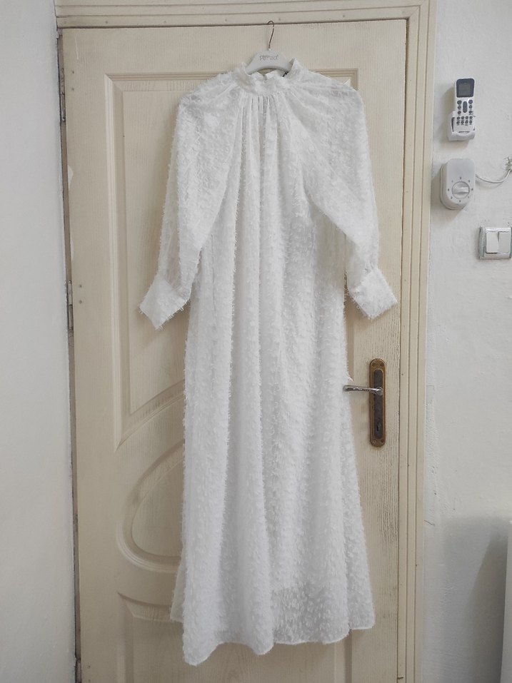 Beyaz uzun nikah elbise, yüksek yakalı ve uzun kollu, bol ve drapeli kesime sahiptir. Rahat ve sade bohem tarzda, günlük kullanıma uygundur. boy 143 cm. kol 62 cm. iki kol arası 56 cm