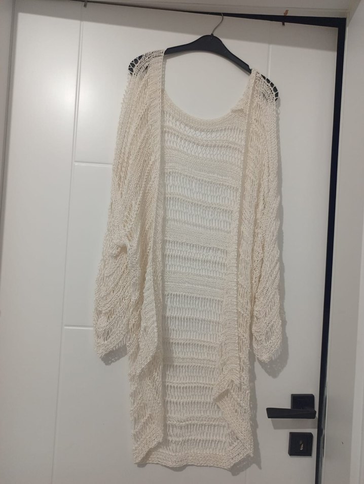 Beyaz renkli, uzun kollu ve bol kesim örgü bohem tarzda, straplez yakalı rahat hırka. Günlük kullanıma uygundur.
