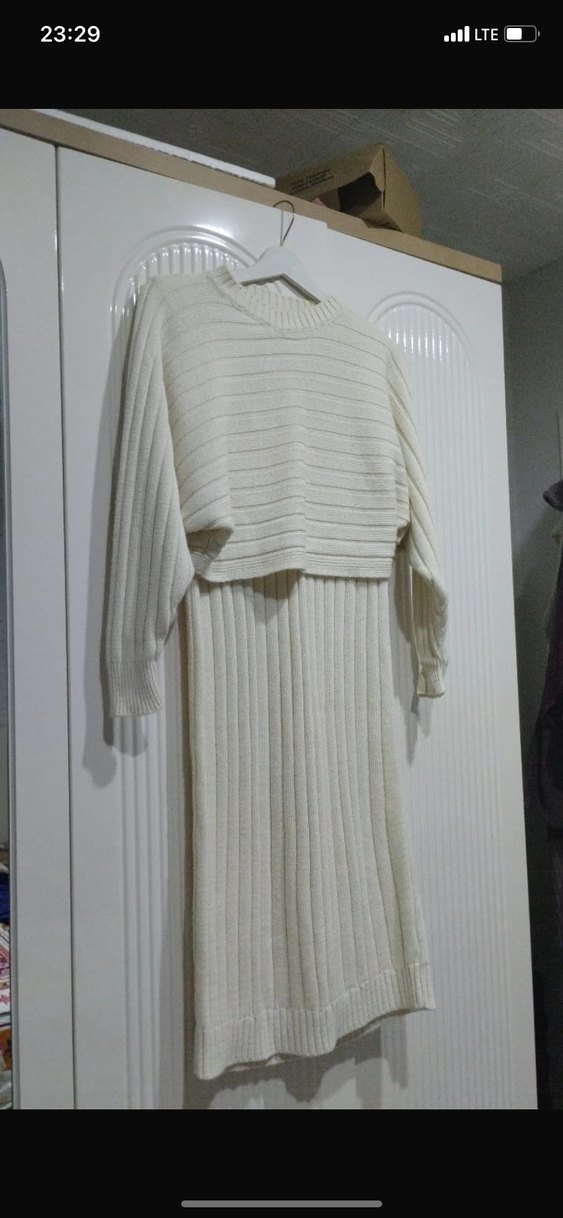 Beyaz örgü kumaştan, uzun kollu, yuvarlak yaka ve bol kesim kadın kazak. Rahat ve sade tasarımıyla günlük kullanıma uygundur. Kazağı ve elbisesi birlikte gelmektedir her iki şekilde de kullanabilirsiniz