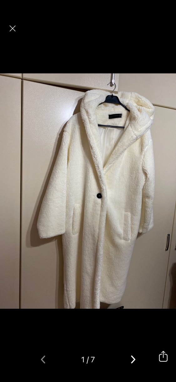 Beyaz uzun peluş kadın kaban, kapişonlu,bol kesim ve kürklü detaylıdır. Yumuşak ve sıcak dokusuyla sokak stiline uygundur. ❄️ iki kez giyildi kusursuz