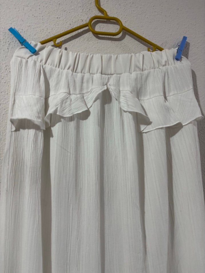Beyaz renkte, pilili detaylara sahip, keten kumaştan uzun ve bol kesim etek. Minimalist bohem tarzıyla günlük kullanıma uygundur.