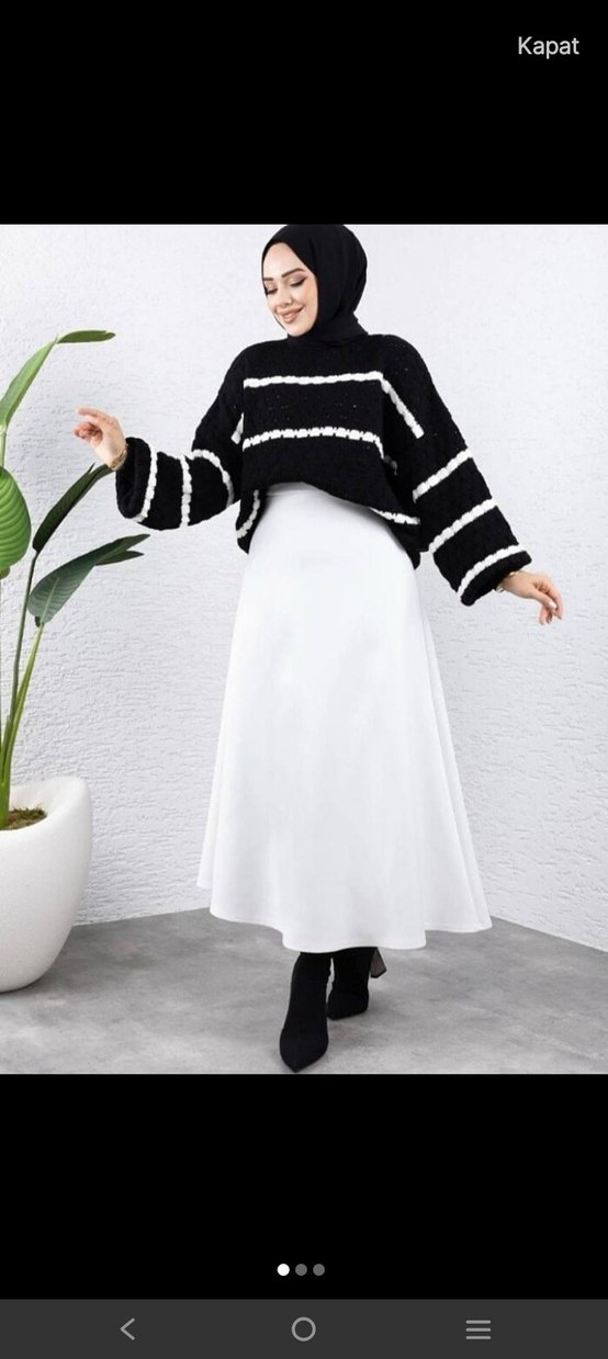 Beyaz uzun etek, örgü dokusu ve salaş kesimiyle rahat ve günlük kullanıma uygun bir tasarımdır. Hafif batik desenlidir.