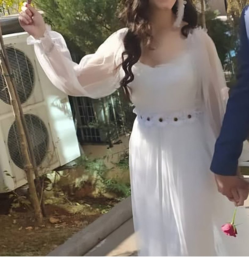 Uzun beyaz elbise, straplez yaka ve bol kesimle dikkat çeker. Uzun, drapeli kollar ve hafif batik desen içerir. Bohem düğünler için uygundur.