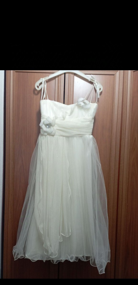 Beyaz renkli, uzun ve straplez kesimli mini gelinlik. İnce askılar ve bohem tarzıyla şık, çiçek detaylı ve hafif kumaştan yapılmıştır.