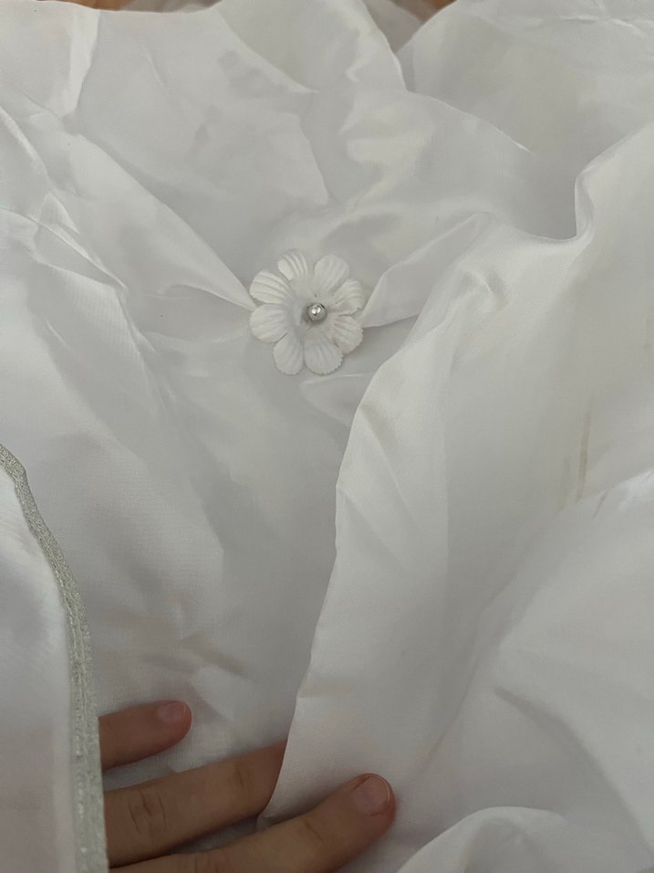 Beyaz uzun gelinlik, straplez yakalı ve ince askılıdır. Prenses kesim etekleri kat kat ve akışkandır, avangart ve bohem tarzındadır. 1 kez giyildi 160 boyum boyuma göre yaptırıldı