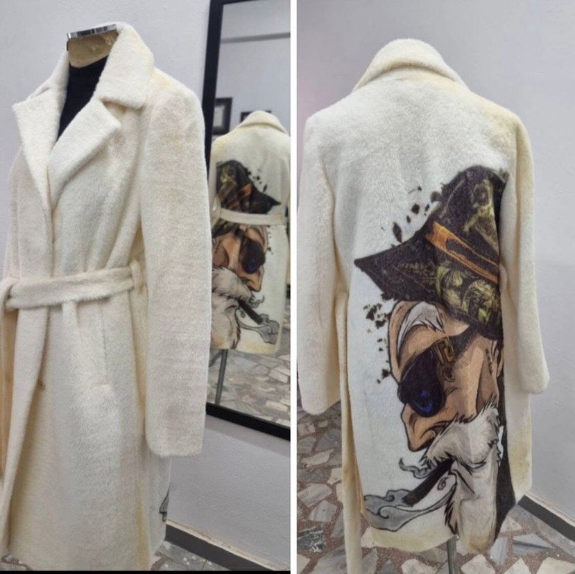 Beyaz uzun tüylü Angora , sırtında baskılı desenli, bol kesim, uzun kollu kadın kabanı. Rahat ve sokak modasına uygun.