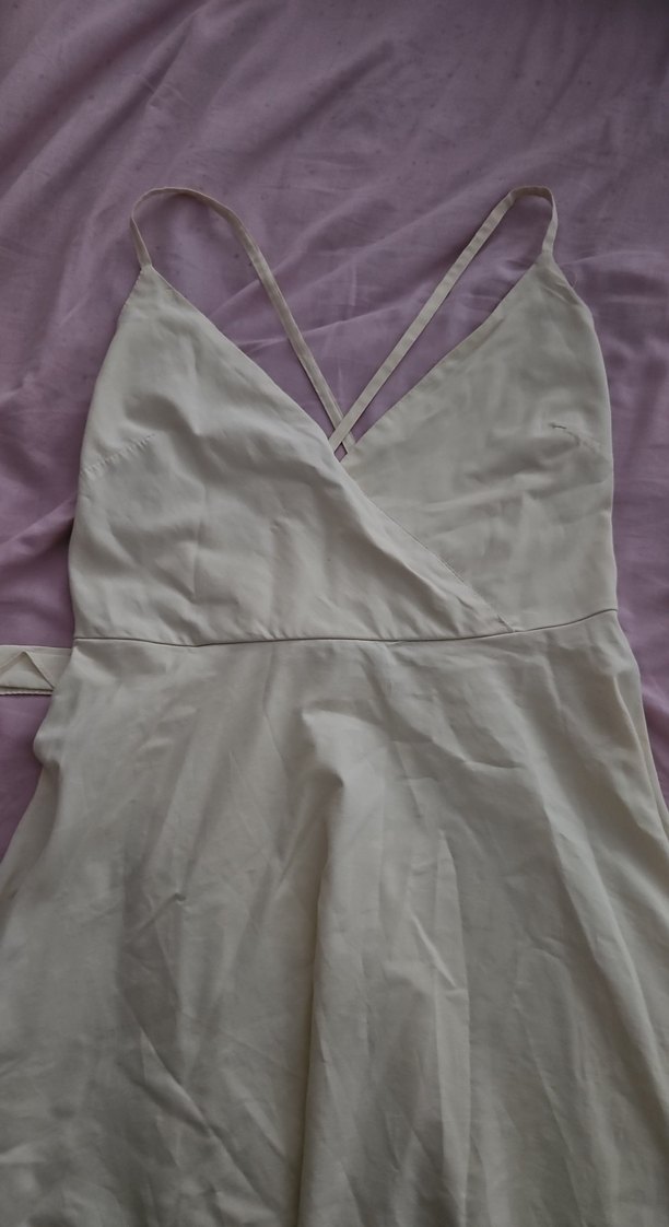 Bu beyaz midi elbise, V yaka ve askılı kol detaylarıyla fit kesime sahiptir. Yumuşak sentetik kumaştan drapeli tasarım, sokak stili ve açık hava için uygundur.