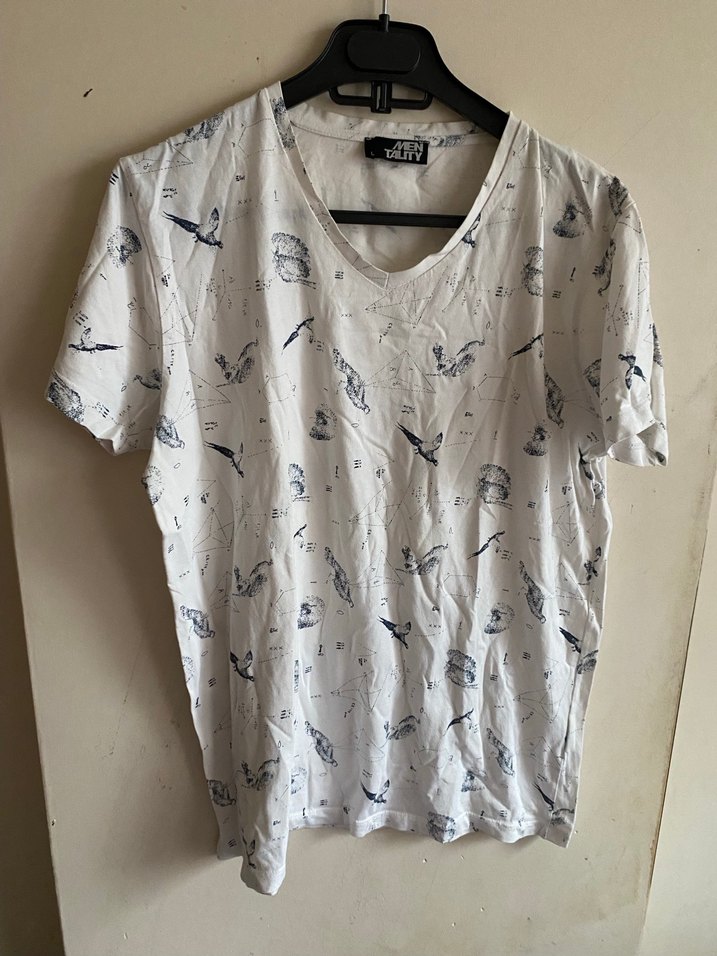 Pamuk kumaştan, beyaz zeminde gri baskılı desenli, V yaka ve kısa kollu, bol kesim erkek tişört. Günlük rahat kullanım için uygundur.