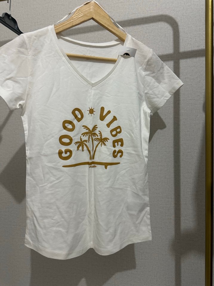 Pamuklu krem tişört, parlak baskılı "GOOD VIBES" yazısı ile kısa kollu ve V yaka tasarıma sahiptir. Salaş kesim ve kısa boyda, rahat sokak stili için uygundur.