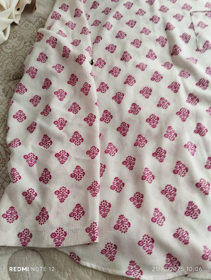 Beyaz renkte, baskılı desenli, V yakalı, uzun kollu ve bol kesim gömlek