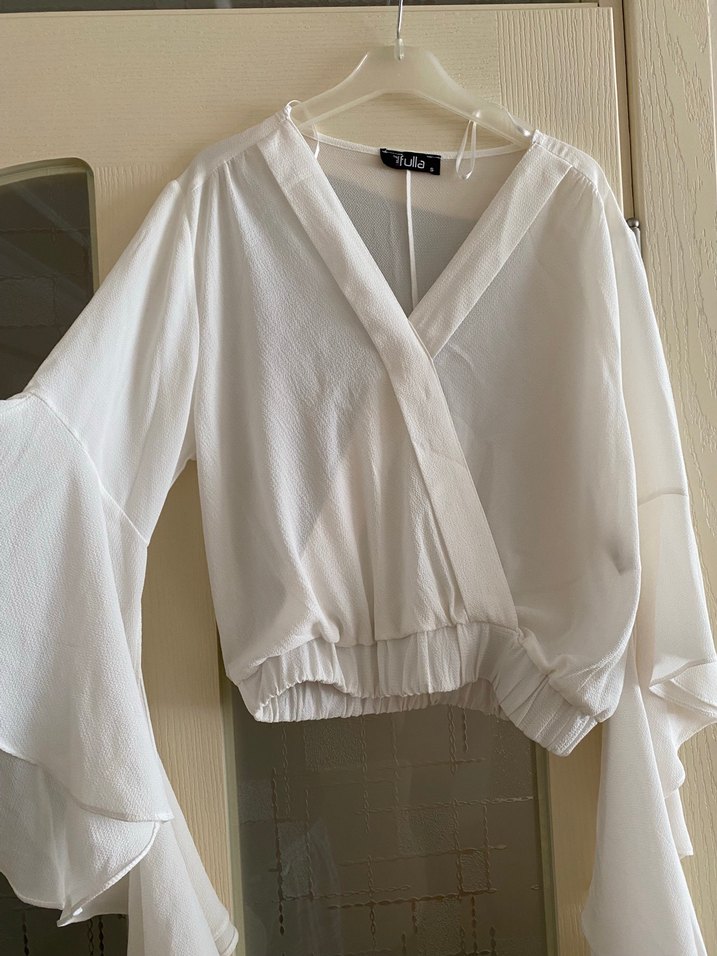 Beyaz bluz, V yaka ve uzun drapeli kollara sahip. Salaş ve kısa kesim, s beden iki sefer giydim