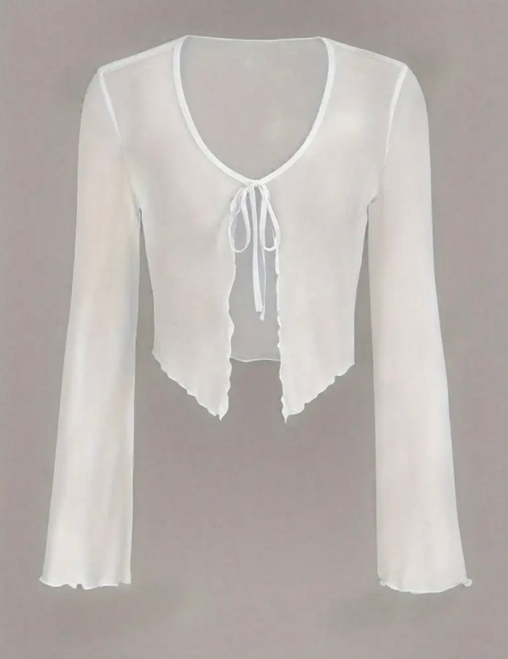 Beyaz, uzun kollu, V yaka, , bağcıklı ve dantel detaylı fitted bluz. Minimalist gotik tarzda, günlük kullanım için uygun.
