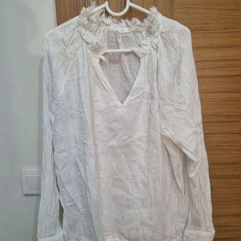 Bol kesim, uzun kollu beyaz keten gömlek, drapeli V yaka ve bohem tarzıyla günlük kullanıma uygun, desensiz ve hafif kumaşlı.