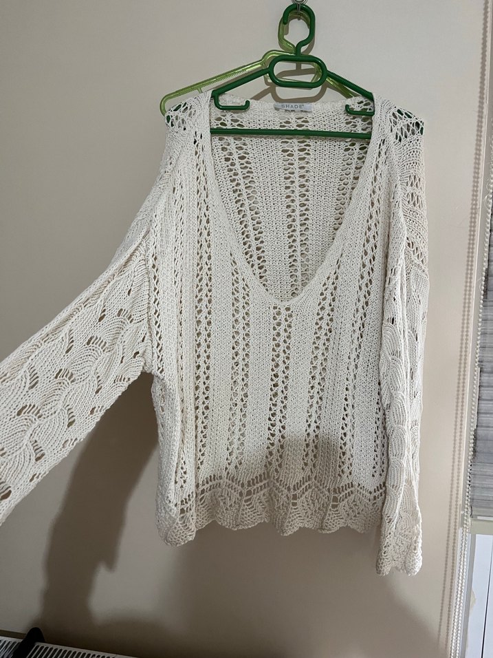 Beyaz renkte, V yakalı ve uzun kollu, bol kesim bohem örgü kadın kazak. Hafif ve desensiz yapısıyla günlük kullanıma uygundur.