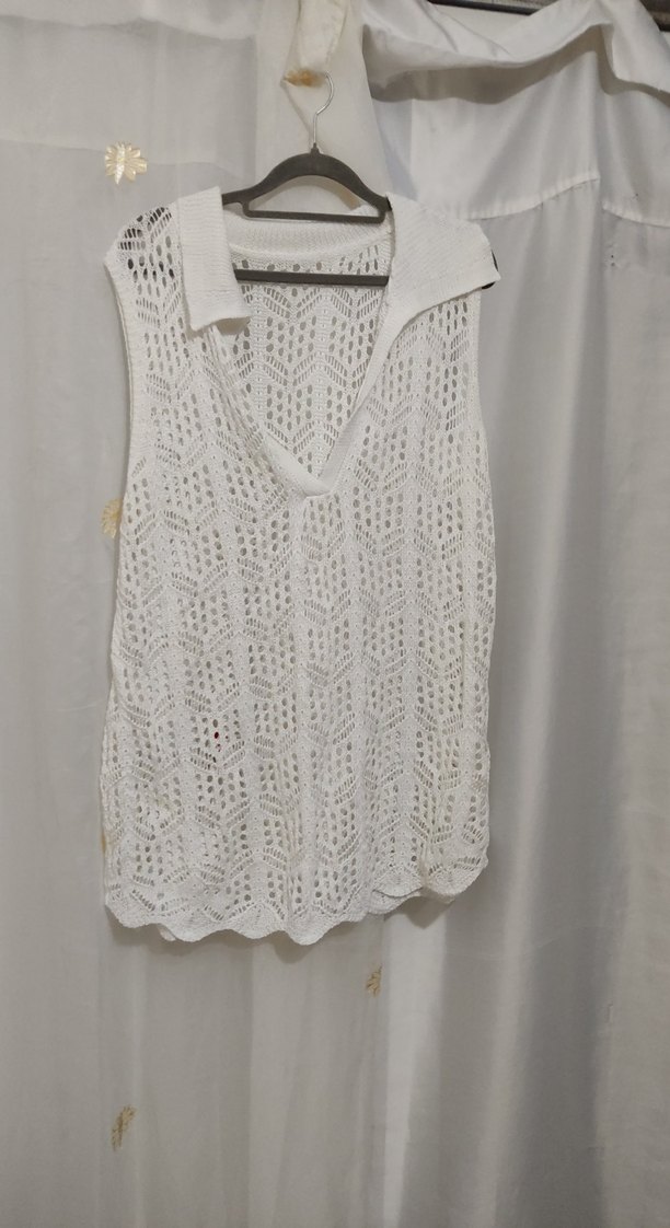Beyaz, V yaka, kolsuz, gevşek kesim örgü süveter. Bohem tarzda, günlük kullanım için uygun, ince delikli örgü deseniyle.