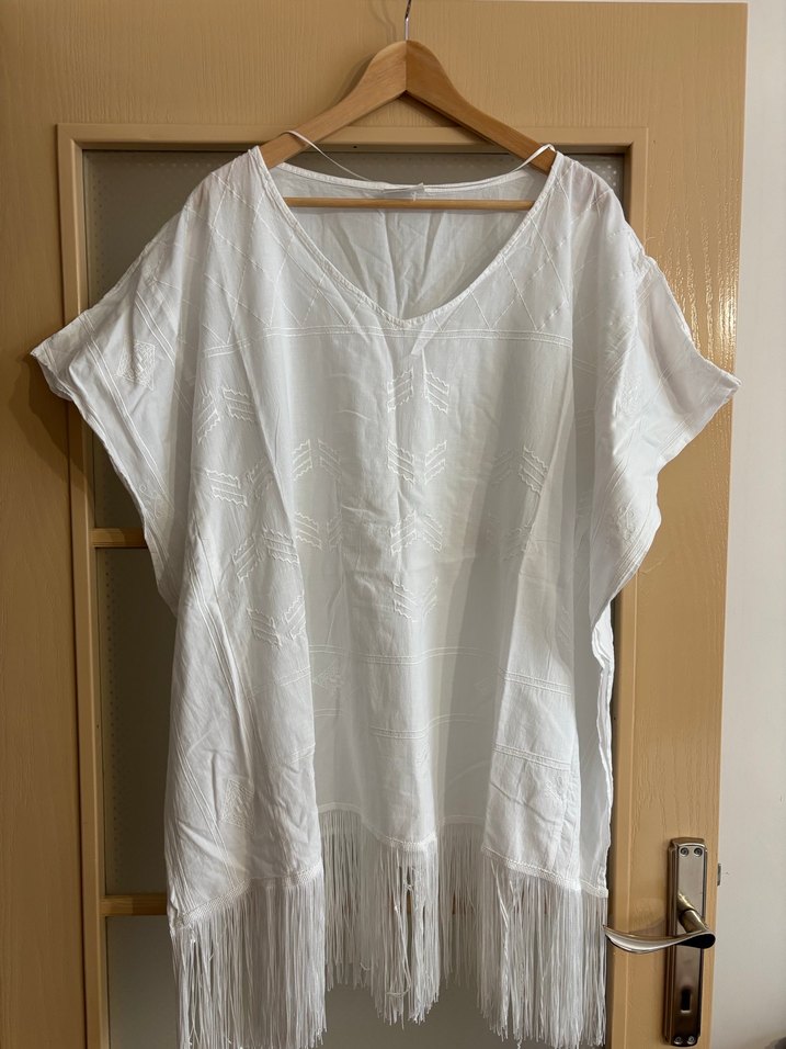 Beyaz pamuklu kumaştan, V yakalı ve kısa kollu, bol kesim bohem tarzda bir plaj elbisesi. Eteğinde püskül detayları ve salaş bir görünümü vardır.