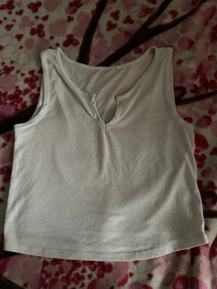 Beyaz, V yaka, kolsuz ve pamuklu kumaştan yapılmış bol kesim kadın crop. Minimalist ve rahat sokak stili, günlük kullanım için uygundur.