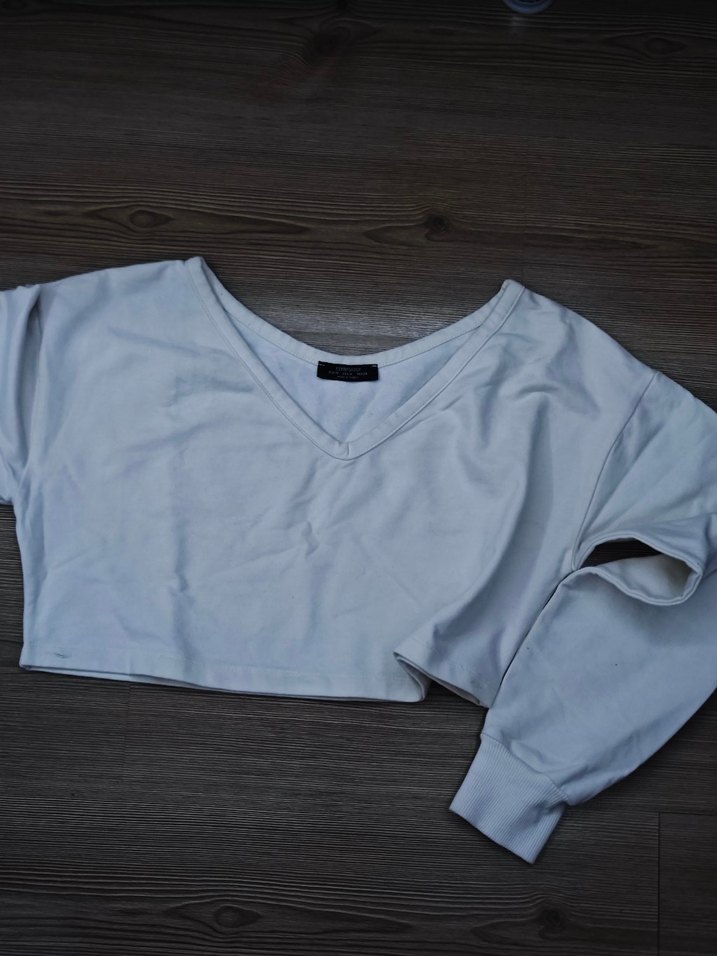Beyaz pamuk crop sweat, V yaka ve uzun kollu, rahat kesimle günlük sokak stili için uygundur. Marka temsilidir.