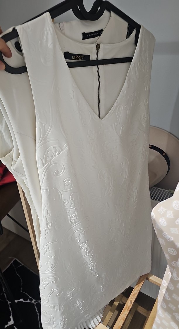 V yaka, kolsuz, parlak beyaz sentetik kumaştan yapılmış, dantel detaylı klasik şıklıkta hamile tunik.
