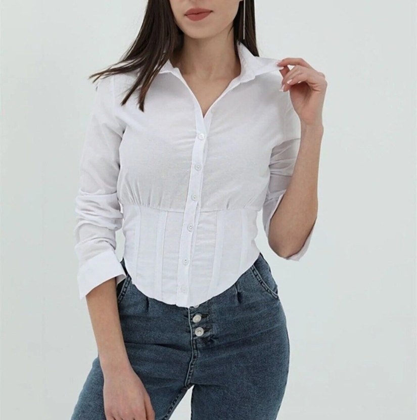 Beyaz V Yaka Denim korseli slimfit gömlek