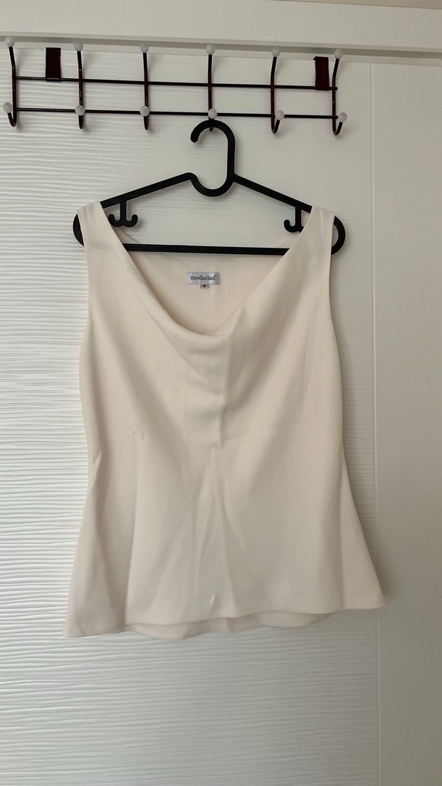 Beyaz, drapeli V yaka ve kolsuz kadın bluz. İnce, ipeksi dokusu ve bol kesimi ile minimalist ofis stiline uygun, midi boyda sade tasarım. ️