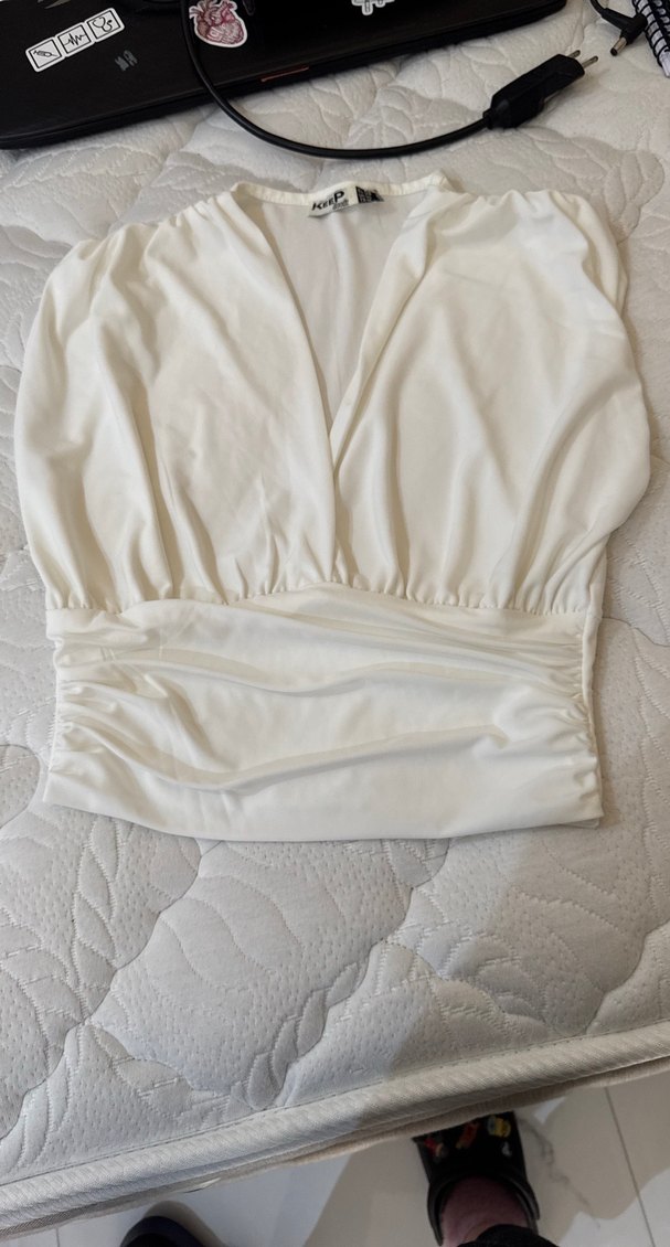 Beyaz renkte, V yakalı, drapeli detaylı, kısa kollu kadın bluz. Vücuda oturan kesimi ve midi boyu ile günlük kullanıma uygun, yumuşak sentetik kumaştan.