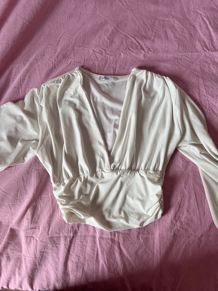 Beyaz renkli, V yakalı ve uzun kollu bu keten bluz drapeli tasarıma sahiptir. Fitted kesimi ve midi boyu ile sokak modasına uygundur.