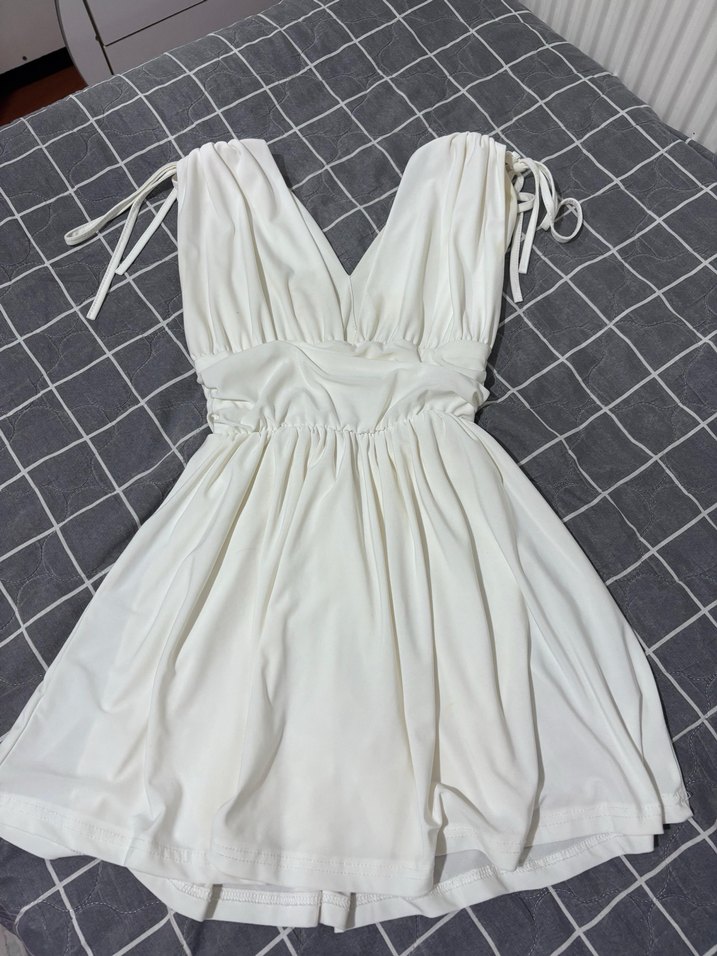 Beyaz, drapeli ve V yakalı, askılı kollu, bohem tarzda, diz boyu ve vücuda oturan gece elbisesi. Düğünler için uygun. ✨