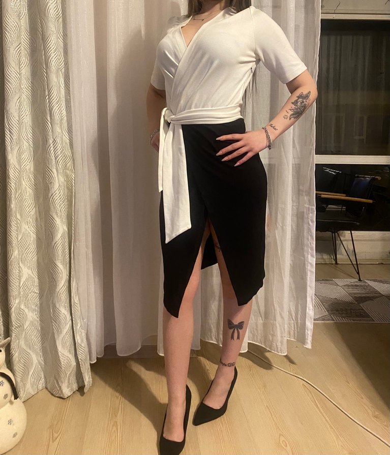 Beyaz renkli, V yakalı ve drapeli tasarıma sahip midi elbise, yumuşak sentetik kumaştan üretilmiştir. İp detaylı kollu ve ön kısmında yırtmaç bulunur.